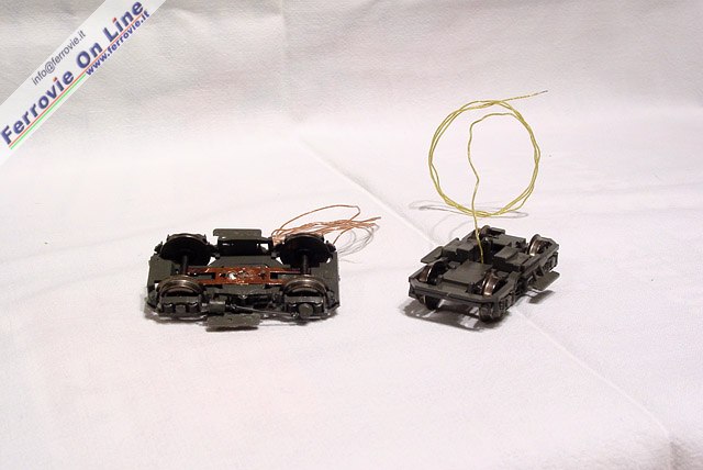 2. Si procede sganciando i due carrelli dal resto del modello. L'operazione avviene con più facilità togliendo prima il tetto della carrozza e agendo con una pinza dall'interno. Vanno poi saldati sulle lamelle i cavetti elettrici che porteranno l'alimentazione al decoder. Infine le lamelle prendi-corrente vanno incollate sui carrelli come visibile nell'immagine, facendo passare i cavi da uno dei fori già presenti ai lati del perno di rotazione. E' necessario verificare che gli assi di ciascun carrello siano installati con la parte isolata sullo stesso lato e contrapposta rispetto a quella degli assi dell'altro carrello al fine di evitare cortocircuiti.