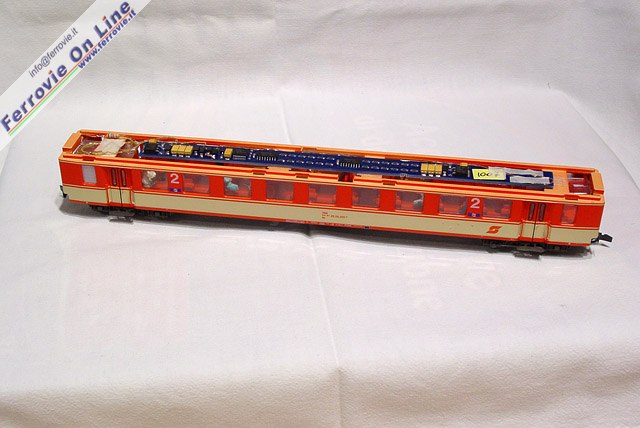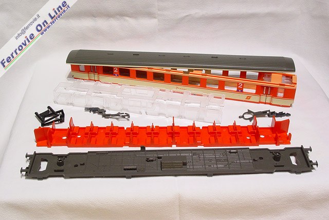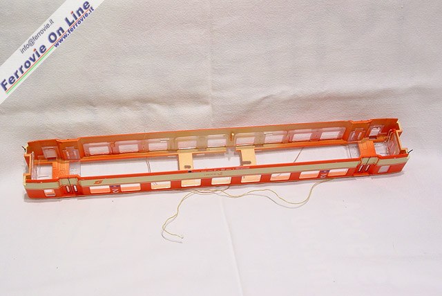 3. E' il momento di smontare completamente, o quasi, la carrozza. Se non lo si è già fatto in precedenza, si toglie il tetto agendo senza far troppa forza lungo il perimetro di separazione con la cassa. Dopo aver tolto i timoni di allontanamento del gancio e i mantici di intercomunicazione, aiutandosi con delle carte telefoniche o con del cartoncino si libera la riproduzione del telaio allargando la cassa nella parte inferiore. Va fatta attenzione a due incastri cilindrici nella parte centrale delle due fiancate. Togliendo la riproduzione del telaio si libera anche l'elemento che imita, in modo molto semplificato, l'arredamento interno. A questo punto, con molta prudenza, si liberano i finestrini laterali dalla loro sede, in modo poi da togliere l'intero blocco trasparente che li riproduce.