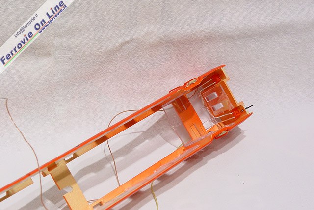 7. Si procede quindi al rimontaggio dei vari elementi della carrozza, avendo cura di far fuoriuscire dall'alto i quattro cavetti elettrici. I due cavetti provenienti dalle lamelle posizionate sui carrelli vanno fatti passare attraverso due fori già presenti.