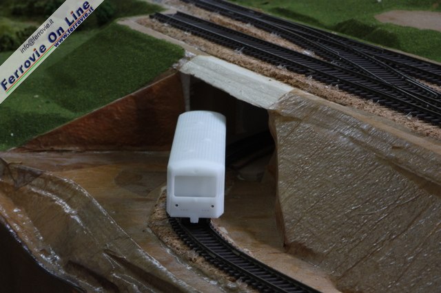 7. Il campione di prova del modello in resina si pavoneggia sul binario a scartamento ridotto di un modulo FREMO-Calabria. (Foto Mario De Prisco, 17 aprile 2011)