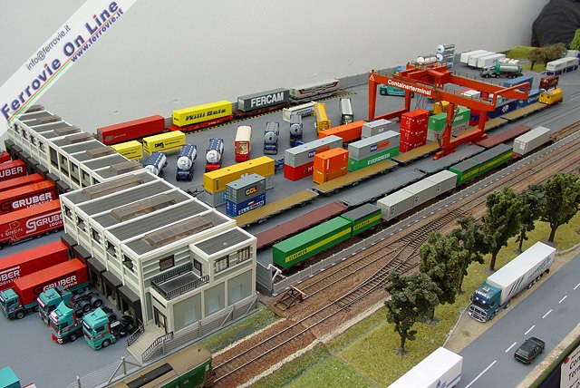 Plastico "Terminal intermodale" Autore Rino Danzico Scala H0 Il Terminal Intermodale è dotato di una gru a portale digitalizzata che consente il carico e lo scarico dei container e delle casse mobili dai convogli ferroviari che operano all'interno dell'area, movimentando gli stessi dai raccordi di scarico al binario di presa e consegna e successivamente da e per il binario di transito. Decine e decine di casse mobili, di container e di semirimorchi fanno di questo impianto un unico multicolore diorama. (Foto Fabio Veronesi)