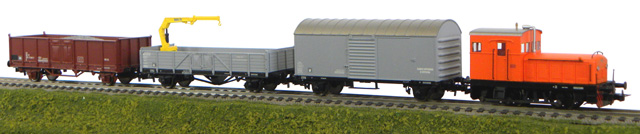 Sempre di Liliput un simpatico treno cantiere composto da locomotiva Diesel ABL in arancio, un carro chiuso e due carri aperti, tutto con iscrizioni in italiano.