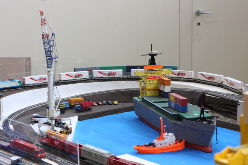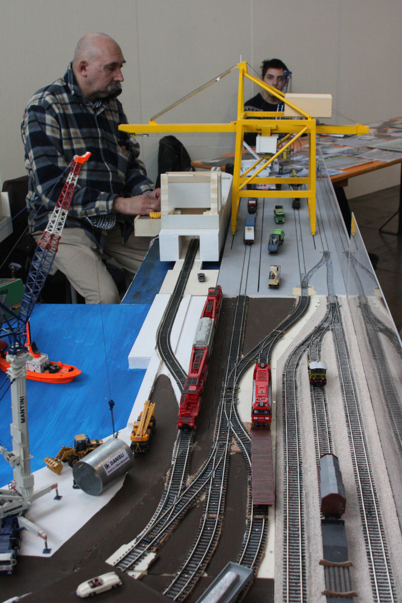 Il Ferclub di Trieste ha presentato la riproduzione di una banchina del porto dedicata al trasporto container dove si potevano ammirare i lenti spostamenti di una imponente gru per la movimentazione dei container fra molo e mezzi presenti sul molo.