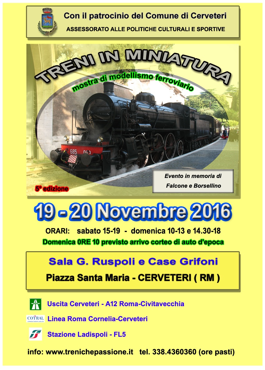 Sabato 19 e domenica 20 novembre a Cerveteri, nella Sala Ruspoli e Case Grifoni del cinquecentesco Palazzo dei Principi Ruspoli e nell'antistante Piazza Santa Maria, si svolgerà l'evento TRENI in MINIATURA, un evento di modellismo ferroviario e sfilata di auto storiche, dedicato al ricordo dei giudici Giovanni Falcone e Paolo Borsellino e dei loro agenti di scorta.