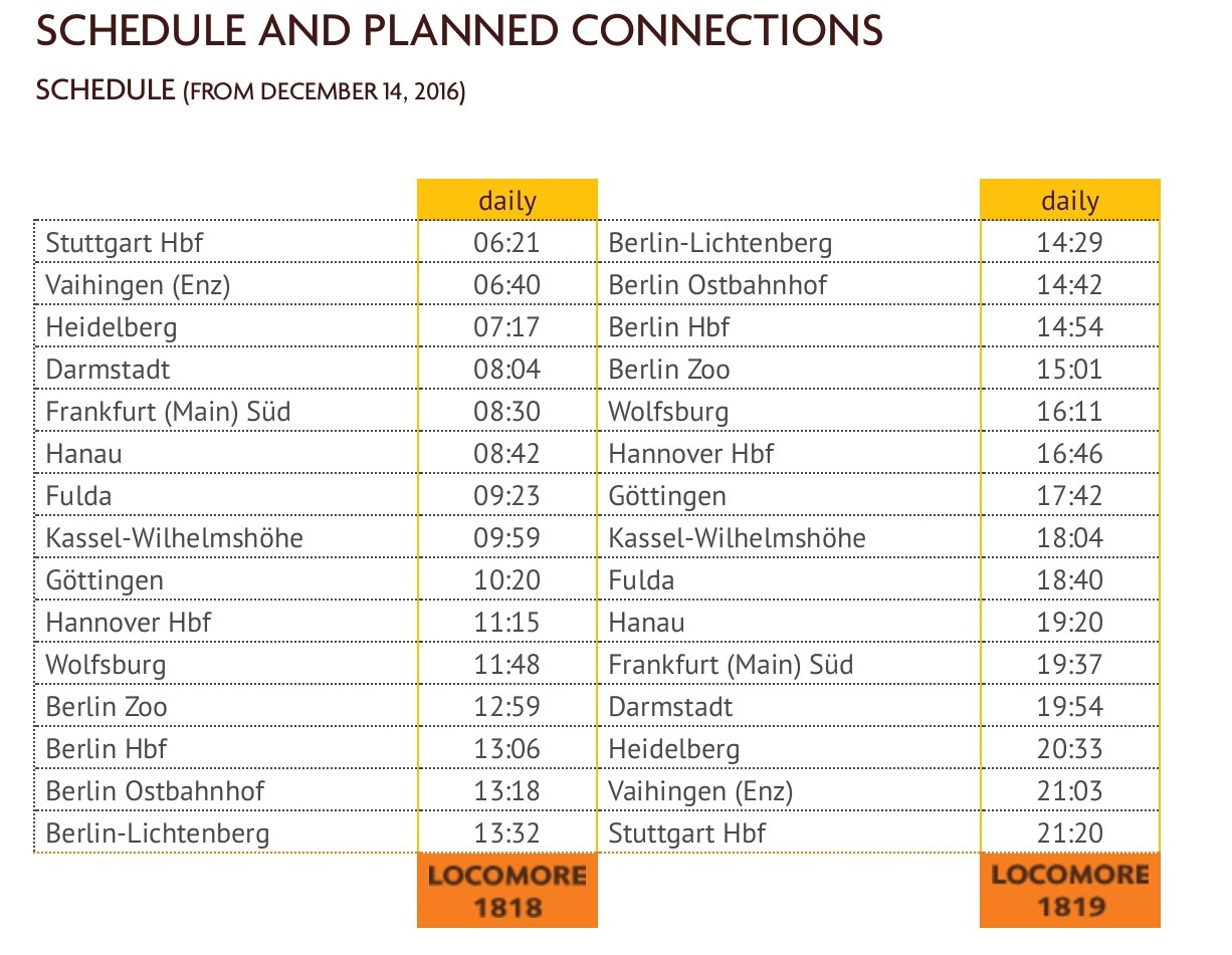 BERLINO (Germania) - Posticipata di alcune settimane rispetto ai programmi iniziali, è quasi al nastro di partenza l'avventura della tedesca Locomore. La nuova impresa ferroviaria passeggeri che debutterà il prossimo 14 dicembre (vedi Approfondimenti del 28/09/2016), da venerdì 11 novembre ha avviato su www.locomore.de la vendita dei biglietti per viaggiare tra Stoccarda, Francoforte, Hannover e Berlino fino al 20 giugno 2017. E' questa la prima relazione che sarà servita da una coppia di treni al giorno tra Stoccarda e Berlino (effettuata su rete DB), collegate in circa 7 ore. La tariffa minima è di 7 Euro per le relazioni più brevi e massima di 22 Euro per la percorrenza completa, per prenotazioni effettuate con largo anticipo; avvicinandosi alla data di partenza le tariffe potrebbero risultare più care, ma comunque sempre più economiche di quelle proposte da DB anche per i titolari di Bahn Card.