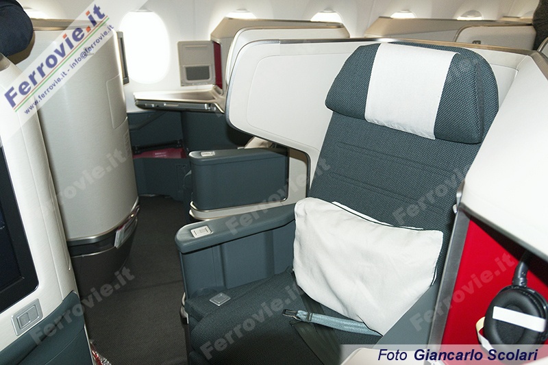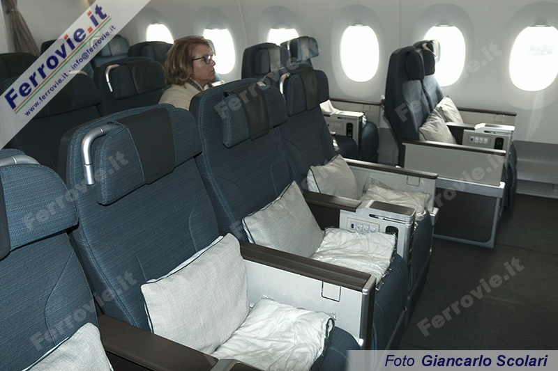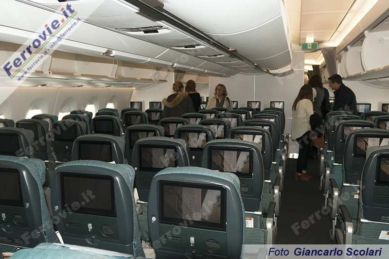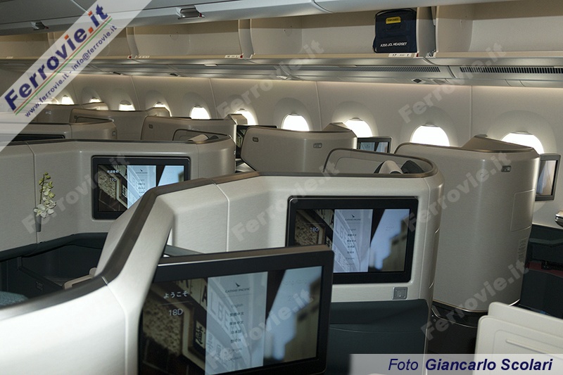 La configurazione scelta da Cathay prevede in totale 280 posti in tre classi di volo: 38 in Business Class, 28 in Premier Economy e 214 in Economy. Nuove le poltrone in Business Class che hanno la possibilità di tramutarsi in un ampio letto, ampi gli spazi per gli effetti personali, pannelli per la privacy. Molto importante l'intrattenimento di bordo: ogni poltrona ha uno schermo da 18,5" dove è possibile guardare tre canali televisivi live: BBC, CNN e Euronews ma anche leggere un'ampia raccolta di libri internazionali e magazine, poter vedere molti film di cui almeno 5 titoli in italiano e una serie di giochi, come se fosse la consolle di casa. I viaggiatori potranno seguire, attraverso una mappa 3D, il volo dell'aereo.