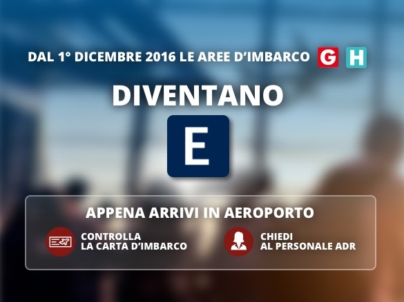 "Dal 1° dicembre 2016 le aree di imbarco G - H diventeranno E. Appena arrivi in aeroporto, controlla la tua carta d'imbarco, chiedi al personale ADR". E' questo il messaggio che da oggi Aeroporti di Roma comunica ai passeggeri del principale scalo della Capitale, per il cambiamento di nome di due aree di imbarco.