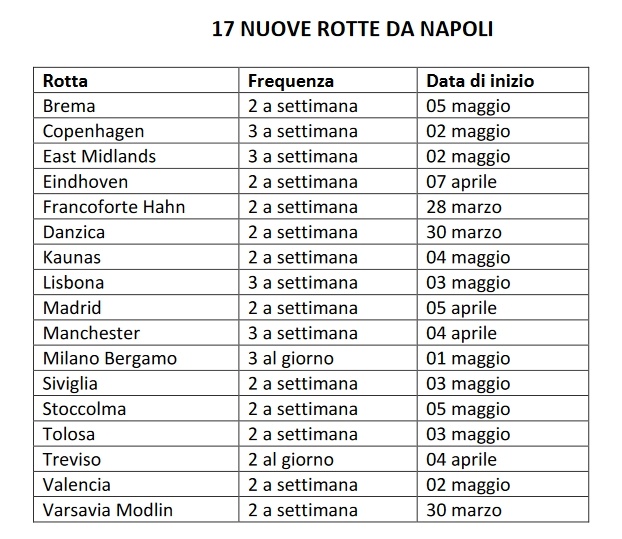 "Ryanair ha il piacere di annunciare che le tariffe low cost sono arrivate a Napoli, nostro 27° aeroporto in Italia, con 17 nuove rotte per Brema, Copenaghen, East Midlands, Eindhoven, Francoforte Hahn, Danzica, Kaunas, Lisbona, Madrid, Manchester, Milano Bergamo, Siviglia, Stoccolma, Treviso, Tolosa, Valencia e Varsavia Modlin, operative da marzo, e che contribuiranno a trasportare 1 milione di clienti all'anno presso l'aeroporto di Napoli.