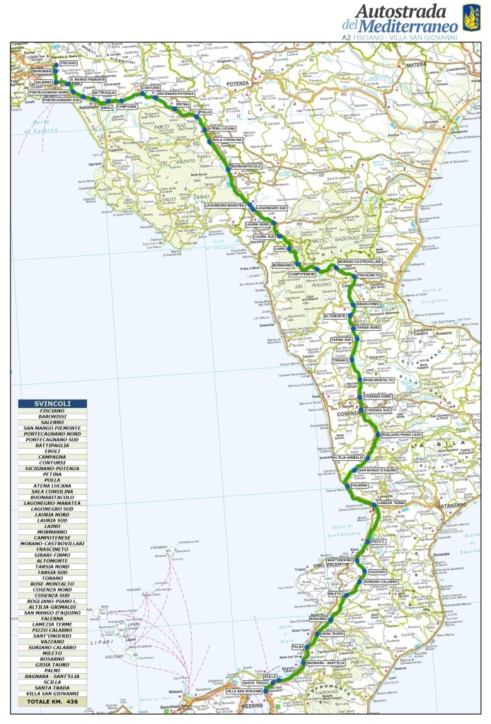 La A2-Autostrada del Mediterraneo, lunga 436 Km, inizierà in località Fisciano (Sa), dove ha sede l'Università degli Studi di Salerno, e terminerà a Villa San Giovanni (Rc) porta di accesso alla Sicilia e naturale conclusione dell'itinerario internazionale E45.
