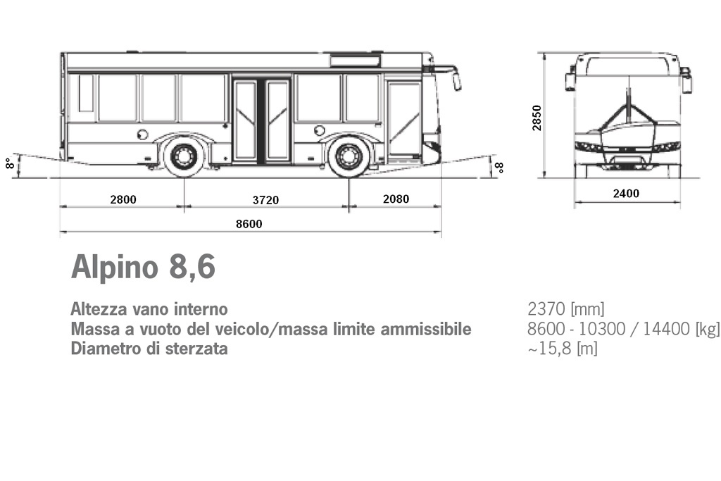 Il modello è il Solaris/Urbino/Alpino 8,6 a pianale ribassato (a meno di 32 cm), che può considerarsi un discreto connubio tra estetica e funzionalità, a detta di Esperti e Conducenti, caratterizzato da ottime doti di affidabilità, di sicurezza e di rispetto dell'ambiente. Il segno inconfondibile di questo bus è il parabrezza con una linea inclinata (Foto 1) che permette al conducente una maggiore visibilità del bordo del marciapiede sul lato destro del veicolo, aumentando la sicurezza delle persone in attesa alla fermata dell'autobus.