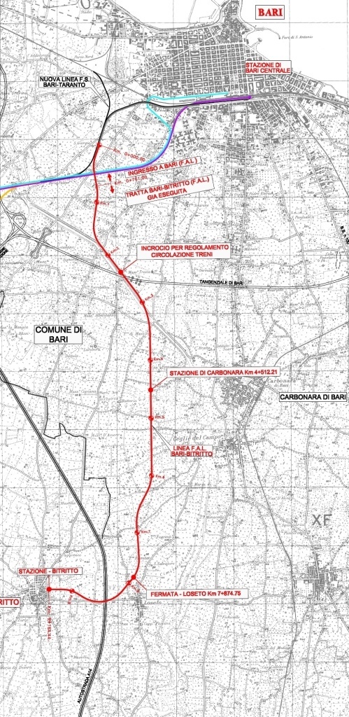 La linea ha una lunghezza di 9,1 km a semplice binario con scartamento ordinario ed elettrificata a 3 kV in corrente continua (vedi News ferroviarie del 01/10/2015). Una volta terminata collegherà Bari Centrale a Carbonara in 11 minuti e a Bitritto in 15 minuti attraversando le stazioni di Bitritto, Loseto e Carbonara, realizzate ex novo sempre da FAL e dotate di parcheggi di scambio e biglietterie. L'esercizio sarà invece affidato alla Ferrotramviaria SpA.