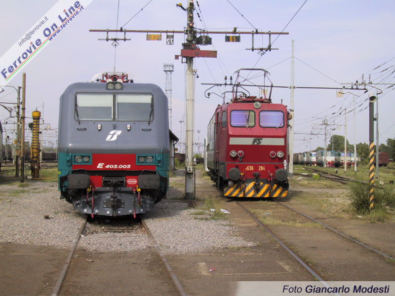 Nel Deposito di Milano Smistamento la moderna E.405 attende di entrare in servizio, mentre al suo fianco la E.636.284 "Camilla" manovra con entrambi i pantografi in presa. (Foto Giancarlo Modesti, 26 giugno 2003)