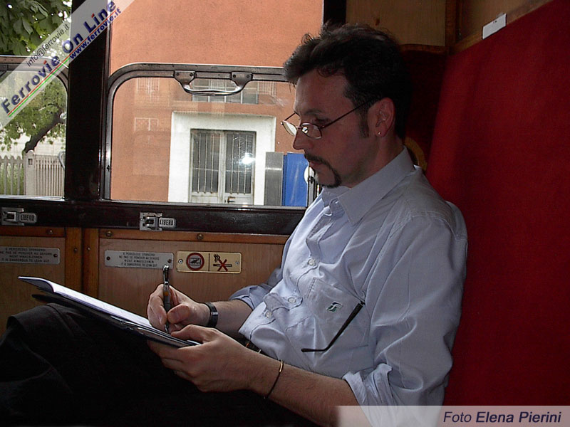 Dopo aver condotto la E.626.194 con il suo treno speciale da Roma a Ciampino, il Macchinista si dedica alla compilazione del TV 80 in attesa del viaggio di ritorno, accomodato in una elegante carrozza a terrazzini di prima classe. (Foto Elena Pierini, 8 aprile 2004)