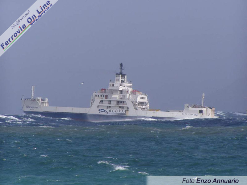 Le Ferrovie dello Stato italiane non si occupano esclusivamente di trasporto su ferro ma anche di trasporto marittimo, garantendo con Bluvia la continuità territoriale tra Continente, Sardegna e Sicilia 365 giorni l'anno, con qualsiasi condizione metereologica. Ed il mare in burrasca non sembra impensierire più di tanto la Fata Morgana, che affronta lo Stretto di Messina con il suo carico di automobili e camion. (Foto Enzo Annuario, 29 dicembre 2004)