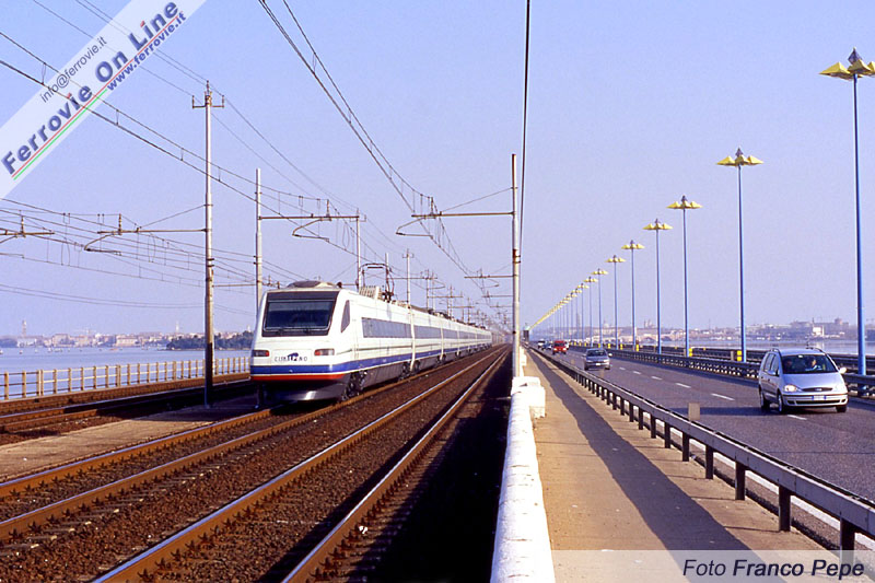 Il ponte ferroviario che unisce Venezia alla terra ferma è uno dei punti più trafficati delle ferrovie italiane. Sui quattro binari del ponte della Laguna (inaugurato a doppio binario nel 1846 e quadruplicato negli anni '70 del '900) è possibile vedere quotidianamente treni di diverse amministrazioni europee. Quello nella foto è un ETR.470 della società italosvizzera Cisalpino, che collega quotidianamente Ginevra con Venezia. (Foto Franco Pepe, 18 marzo 2005)