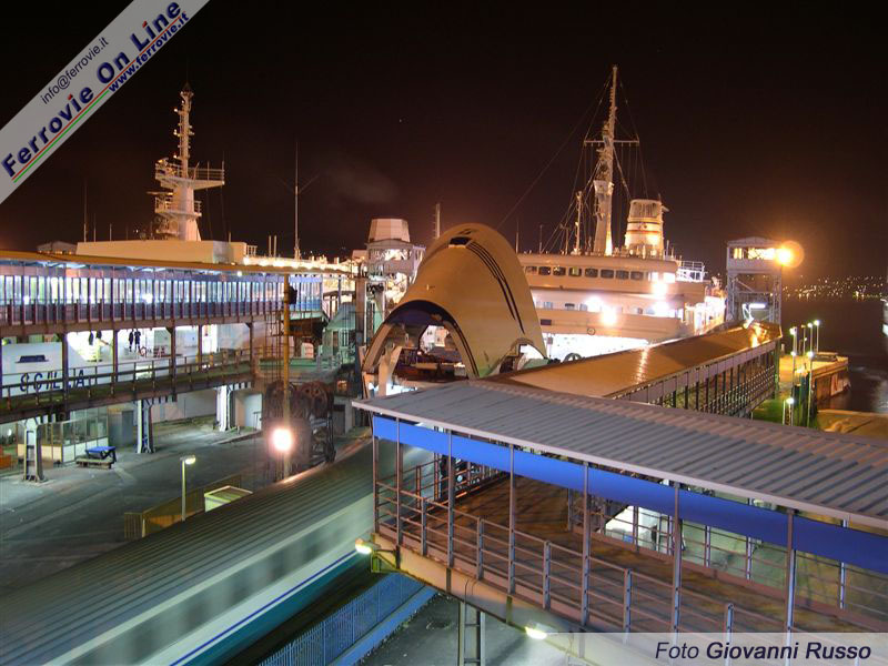 Nel cuore della notte la nave traghetto Scilla riposa nelle invasature di Villa San Giovanni in attesa di un nuovo giorno di lavoro, mentre dalla pancia della Sibari appena giunta da Messina sbarca l'ICN 792 "Conca D'Oro" per Roma. (Foto Giovanni Russo, 31 ottobre 2005)
