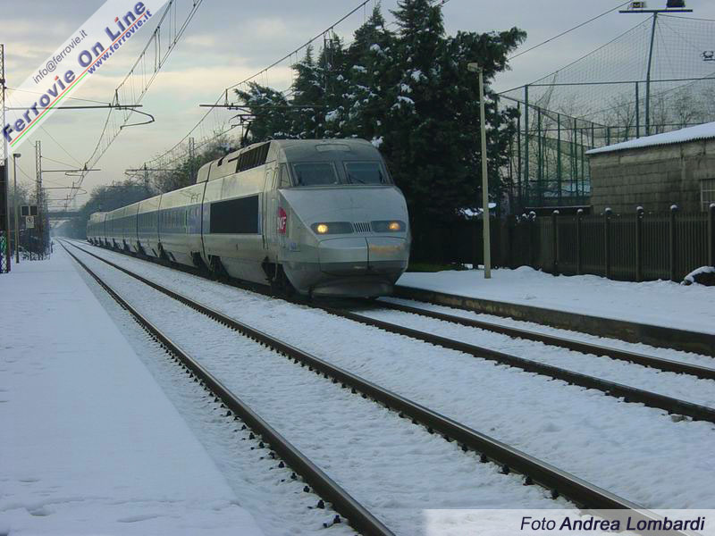 Un TGV proveniente da Parigi e diretto a Milano C.le transita nella stazione di Corbetta - Santo Stefano Ticino, ricoperta da un sottile manto di neve. (Foto Andrea Lombardi, 3 dicembre 2005)