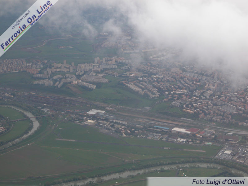 Insolita visuale di Roma Smistamento, ripresa da un aereomobile in atterraggio a Roma Ciampino. Delimitato dalla linea Direttissima e la linea lenta Roma - Firenze, l'impianto risalta tra il fiume Tevere ed il quartiere Nuovo Salario, che si riconosce immediatamente alle spalle seppur parzialmente coperto da una nuvola. (Foto Luigi d'Ottavi, 12 aprile 2004)