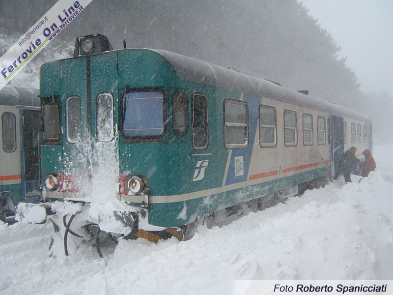 Nonostante la bufera di neve abbia ricoperto oltre misura i binari della stazioncina di Campo di Giove, la ALn 668.3302 è comunque riuscita a portarsi in primo binario, per incrociare un'altra automotrice dello stesso gruppo diretta a Sulmona. (Foto Roberto Spanicciati, 23 dicembre 2003)