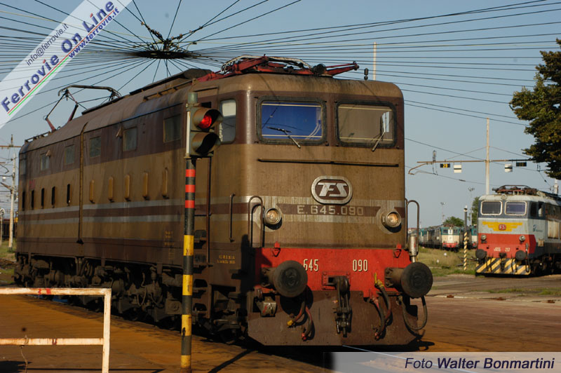 In Deposito a Milano Smistamento, la E.645.090 ha impegnato la piattaforma ed attende per la giratura. (Foto Walter Bonmartini, 19 agosto 2005)
