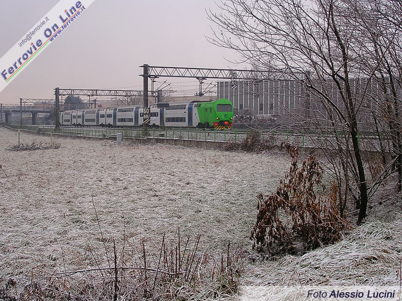 In una fredda mattina di fine dicembre, un complesso TAF delle Ferrovie Nord Milano transita nei pressi di Saronno, immersa in un suggestivo paesaggio imbiancato dalla brina. (Foto Alessio Lucini, 28 dicembre 2005)