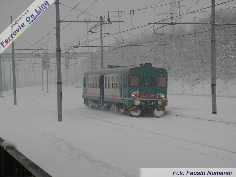 L'eccezionale ondata di maltempo che ha interessato il nord Italia nell'ultima settimana di gennaio, non ha risparmiato il Piemonte. Nell'immagine il Regionale 4850 Alessandria - Pavia, arriva nella stazione di Valenza ricoperta da un'abbondante strato di neve. (Foto Fausto Numanni, 27 gennaio 2006)