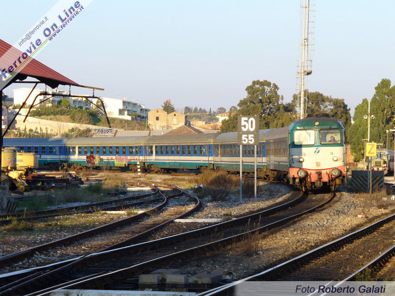 La D.445.1006 impegna il curvone che da' accesso nella stazione di Catanzaro Lido, in testa ad un Invio Materiale proveniente da Reggio Calabria. Le carrozze ripartiranno successivamente per Bari Centrale come Espresso 908 "Freccia Adriatica" (sezione Catanzaro Lido-Bari Centrale). (Foto Roberto Galati, 2 febbraio 2006)