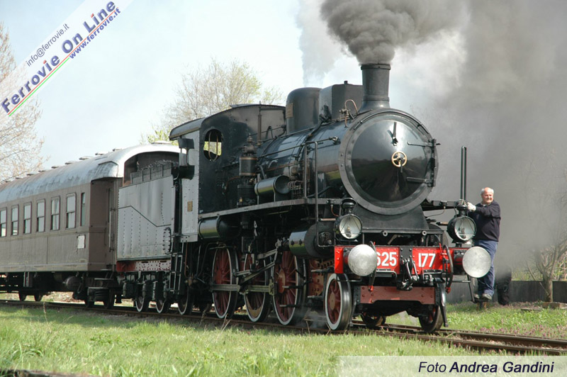Nel corso della recente manifestazione di Milano Smistamento, che ha visto l'esposizione di decine di rotabili d'epoca, la locomotiva 625.177 manovra all'interno dello scalo milanese con al seguito alcune carrozze passeggeri. (Foto Andrea Gandini, 8 aprile 2006)