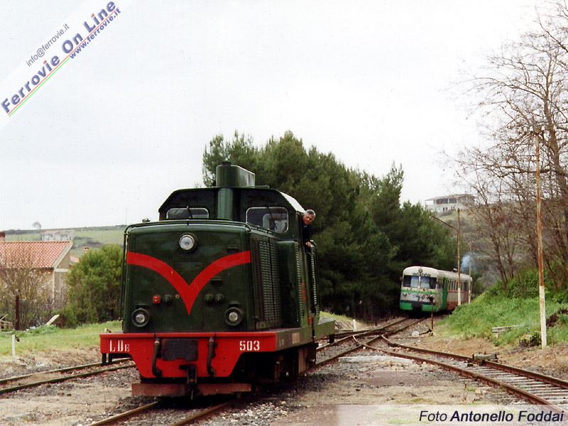 Nella piccola stazione di Nulvi, la Locomotiva LDe 503 fresca di revisione manovra per portarsi alla testa del Trenino Verde. Per far ciò si sono dovute manovrare le due automotrici ADm in sosta nel secondo binario, portandole oltre i deviatoi. (Foto Antonello Foddai, 12 marzo 2006)