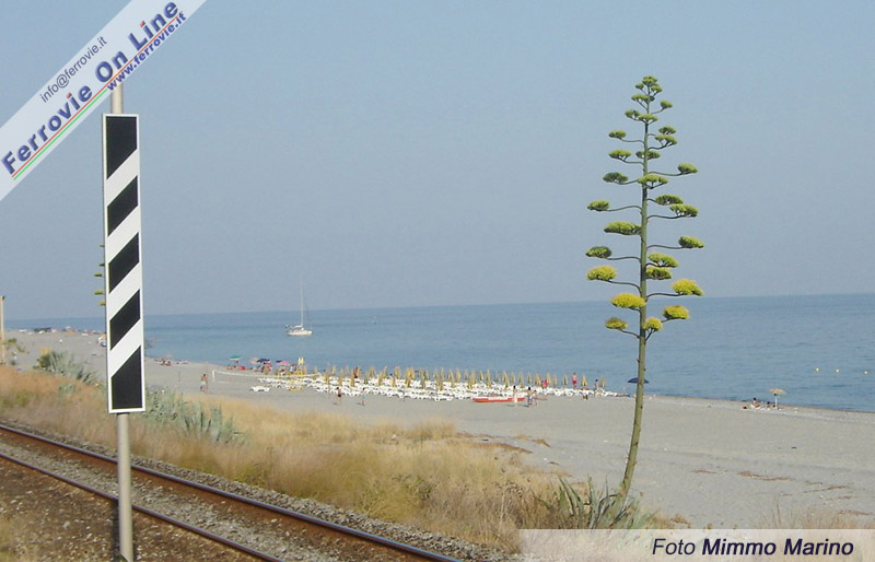 Con l'avvento della stagione estiva, la vegetazione mediterranea delinea nuovi scenari per chi viaggiando lungo il perimetro costiero del nostro Paese si affaccia dal finestrino, per ammirare le bellezze paesaggistiche e ambientali. Un chiaro esempio lo si può ammirare lungo la linea Reggio di Calabria Centrale - Taranto nei pressi della stazione di Marina di San Lorenzo, dove l'agave sembra volersi "confrontare" con la tavola di orientamento. (Foto Mimmo Marino, 9 luglio 2006)