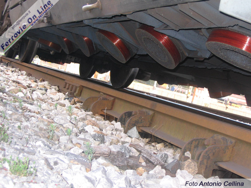 "Visti da sotto" può essere il titolo della foto che ritrae il complesso delle mole installate su uno dei carri operatori in composizione al treno molatore a Luino. E' un'immagine poco consueta, ma è uno dei tanti aspetti legati ad una lavorazione semisconosciuta, ma fondamentale per la manutenzione e per la sicurezza ferroviaria. (Foto Antonio Cellina, 31 marzo 2006)