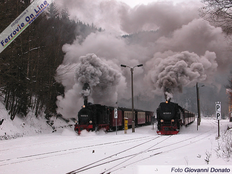 Eccezionale partenza contemporanea a tutto vapore per un treno misto speciale ed un treno passeggeri, entrambi in servizio regolare. Il paesaggio fiabesco è quello del Parco Nazionale di Harz, nella Germania del nord-est, dove corre la ultra-centenaria ferrovia di Harz. (Foto Giovanni Donato, febbraio 2005)