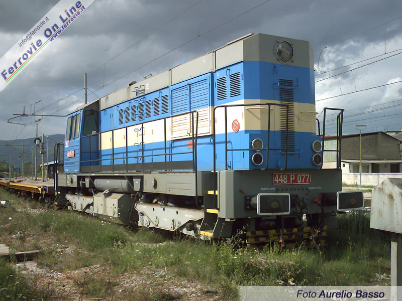 Sotto un cielo plumbeo, a Vairano la possente e spigolosa locomotiva 448 P 077 di Armafer riposa in attesa di entrare in attività con il suo treno cantiere. (Foto Aurelio Basso, 12 agosto 2006)