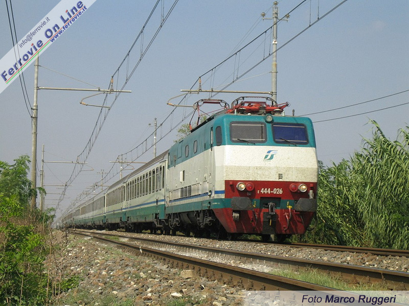 Con il suo lungo treno Intercity, la E.444.026 "Tartaruga" corre veloce verso sud sulla linea Bologna - Ancona, nei pressi di Mirandola Ozzano. (Foto Marco Ruggeri, 6 settembre 2005)
