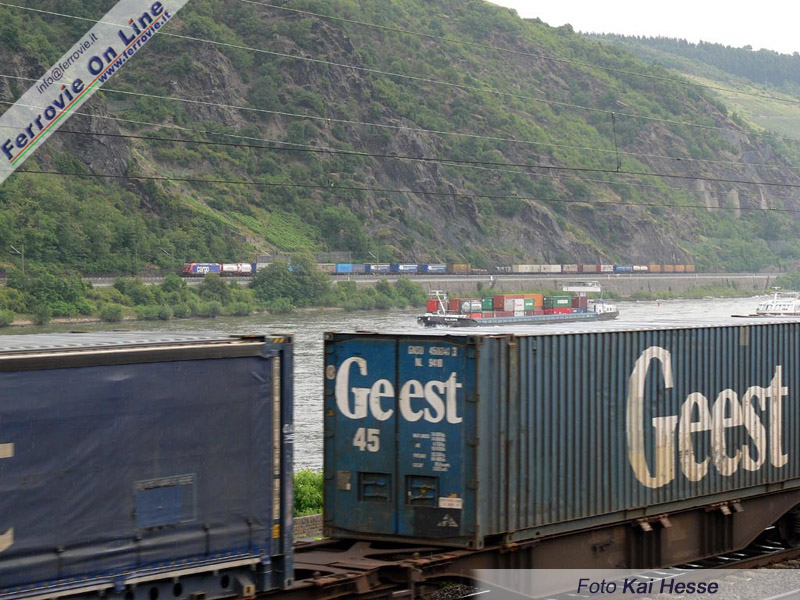 Container, container ed ancora container. L'incredibile traffico merci che anima il fiume Reno e le due ferrovie che lo costeggiano, consente di scattare eccezionali foto come questa, che raffigura due treni merci in corsa carichi di container sulle due sponde del fiume, con al centro un naviglio anch'esso impegnato nel trasporto di casse mobili. (Foto Kai Hesse - www.bahnbilder.net, 15 giugno 2006)