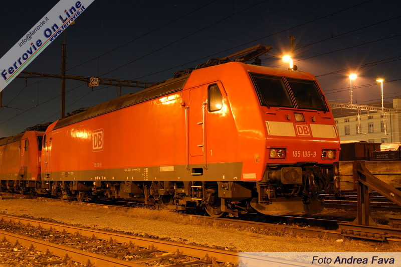 In una serena notte di inizio gennaio, la tedesca 185 136 di DB Railion si lascia ammirare nel fascio merci della stazione di Chiasso. (Foto Andrea Fava, 5 gennaio 2007)