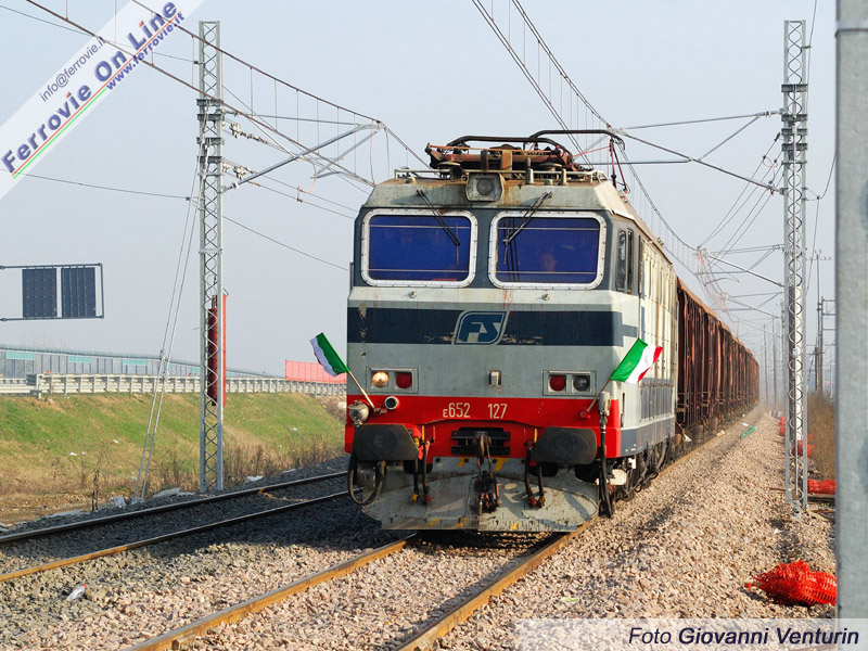 Passaggio inaugurale con un treno merci della E.652.127 da Ponte di Brenta verso Padova, sul quadruplicamento della linea Padova - Mestre. (Foto Giovanni Venturin, 30 dicembre 2006)