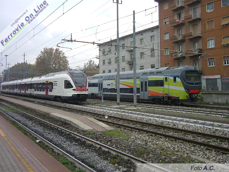 Le corse di prova ed omologazione di nuovi treni, impongono sovente trasferte dei mezzi in aree ben distanti rispetto a quelle in cui sono destinati ad operare. E' il caso di due treni destinati al trasporto Regionale, ripresi ad Arezzo proprio durante le prove: il Flirt di TILO ed il TSR di Ferrovie Nord. (Foto A.C., gennaio 2007)