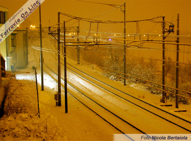 Il silenzio sembra avvolgere il Bivio San Massimo di Verona, ricoperto da un manto di neve da poco caduto, in una fredda notte di inizio marzo. L'atmosfera ovattata è accentuata dalla assenza di treni e dalla foschia che avvolge la zona. (Foto Nicola Bertaiola, 3 marzo 2005)