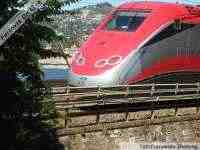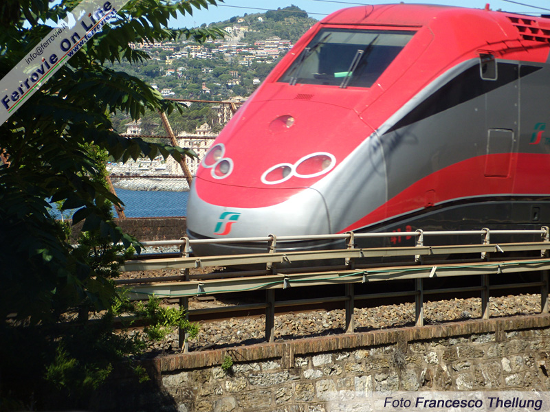 Il muso di un ETR.500 in velocità fa capolino tra la vegetazione, con lo sfondo del mare di Liguria. Siamo tra Rapallo e Zoagli e l'ES AV Fast 9501 Milano - Roma è stato deviato sulla linea Genova - Pisa, a seguito dello svio di alcuni carri di un treno merci tra Bologna e Firenze. (Foto Francesco Thellung, 22 giugno 2009)