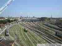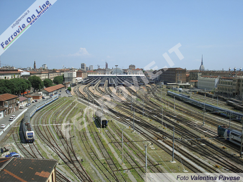 Spettacolare visione panoramica della stazione di Torino Porta Nuova e del suo fascio binari, con la Mole Antonelliana sullo sfondo. Tra i vari rotabili presenti nell'inquadratura, si riconosce sulla sinistra il treno misure "Archimede" di RFI. (Foto Valentina Pavese, 5 luglio 2009)