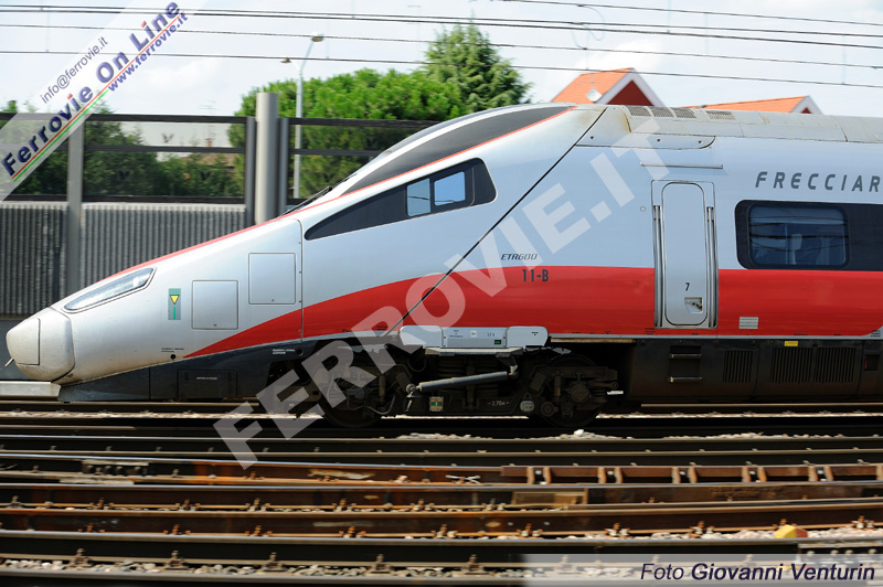 Il filante "muso" di un ETR.600, impegnato con l'Eurostar 9399 in arrivo a Padova da Venezia e diretto a Roma Termini. (Foto Giovanni Venturin, 9 luglio 2009)