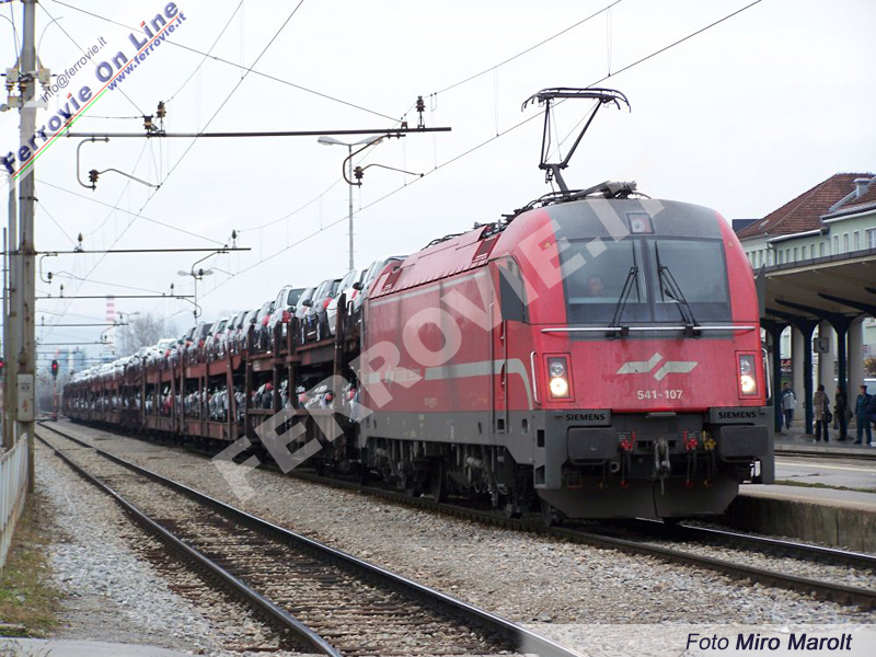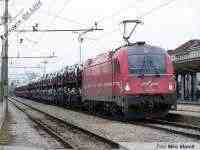 Una moderna locomotiva politensione "Taurus" delle Ferrovie Slovene sosta in testa ad un lungo treno di bisarche nella stazione di Ljubiana, sotto palificazione e mensole della linea aerea tipicamente italiane. (Foto Miro Marolt, 01 gennaio 2006)