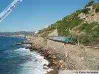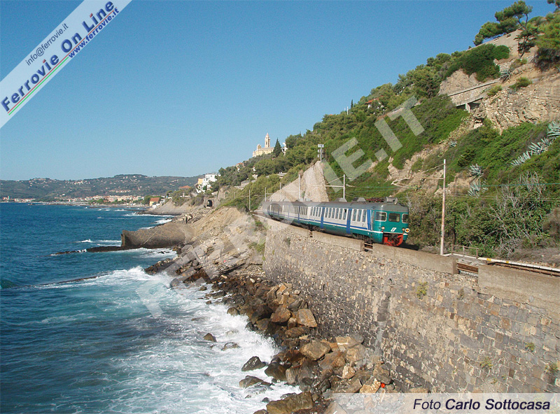 Il suggestivo tracciato a mare della ferrovia del ponente ligure è uno straordinario esempio di come un'opera di ingegneria sia in grado di armonizzarsi con il paesaggio: in certi punti ferrovia, montagna e mare corrono così vicini da sembrare legati da profonda amicizia. Fra Cervo ed Andora, in località Capo Torre, dove la ferrovia serpeggia a picco sul mare fra una lussureggiante vegetazione mediterranea, un complesso di elettromotrici ALe 801/940, presenza ormai abituale nell'estremo ponente, sta espletando un servizio Regionale fra Ventimiglia ed Alassio. (Foto Carlo Sottocasa, 7 settembre 2009)