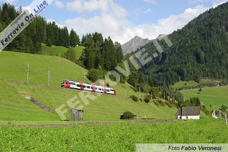Il curatissimo paesaggio tirolese fa da cornice ad un moderno convoglio Talent delle ferrovie austriache ÖBB in servizio regionale tra Innsbruck e Brennero, qui nei pressi della celebre località di St. Jodok. (Foto Fabio Veronesi, 18 settembre 2009)