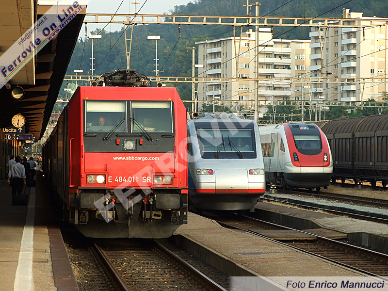 A pomeriggio inoltrato, a Chiasso si presenta una interessante parata di mezzi: la E.484.011 appena arrivata da Milano con il CIS 174, un ETR.470 che espleta probabilmente il CIS 21 verso Milano (senza fermata commerciale nella stazione di Chiasso) e un ICN stazionato. (Foto Enrico Mannucci, 23 settembre 2009)