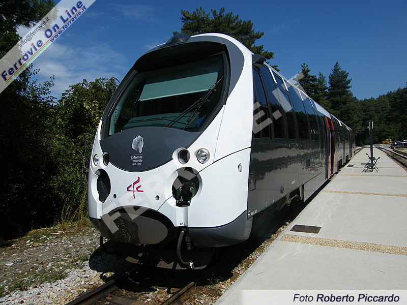 Nella stazione di Vizzavona "u Trinighellu" (che in dialetto corso significa "il trenino") serie AMG 800 è pronto a partire per Ajaccio. Siamo a 906 metri di altitudine, nel punto culminante della linea, a 107 km da Bastia e 50 Km da Ajaccio. (Foto Roberto Piccardo, 2 settembre 2009)