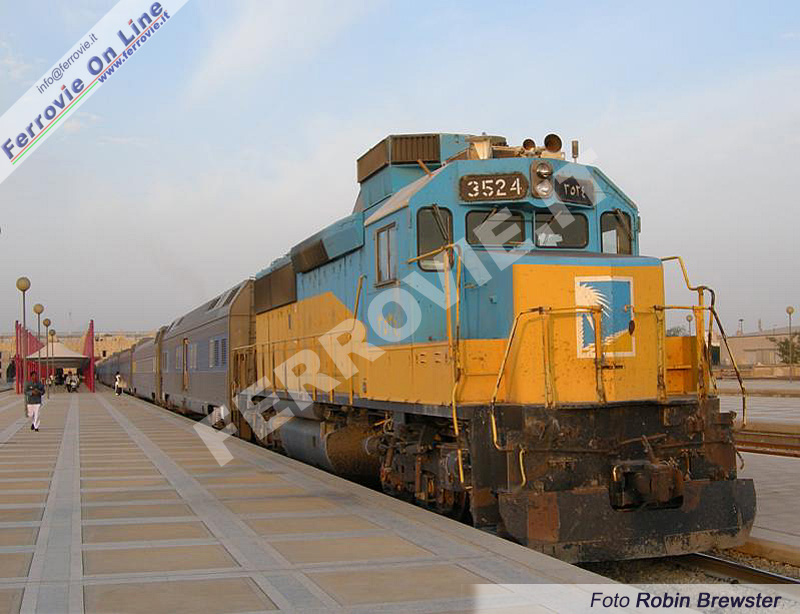 Locomotiva Diesel 3524 della Saudi Railways Organization a Riyadh, in testa al treno Numero 2, pronto per la partenza alle 7.11 del mattino per Dammam. (Foto Robin Brewster, 30 novembre 2009)