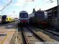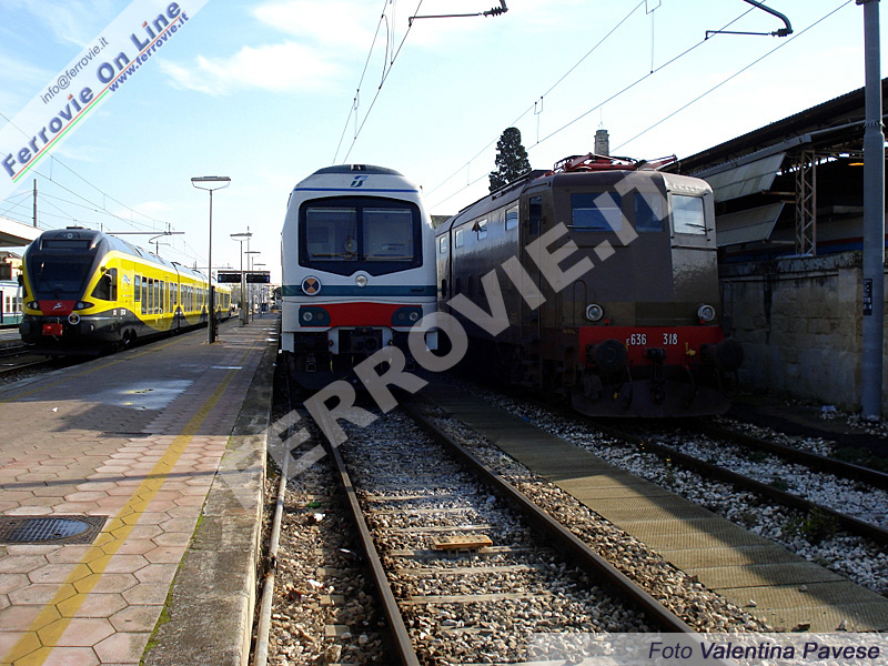 Tre tipologie di mezzi a confronto nella stazione di Lecce. A destra la E.636.318 del treno storico di Santa Lucia, al centro una moderna carrozza pilota "Vivalto" ed a sinistra un ETR.341 della Ferrotramviaria Spa, nello stesso giorno della presentazione ufficiale del collegamento rapido "Acquario" tra Bari e Lecce. (Foto Valentina Pavese, 13 dicembre 2009)