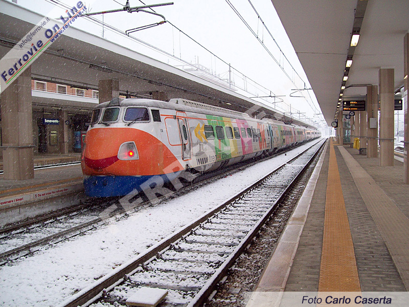 Mentre i fiocchi di neve imbiancano la stazione di Benevento, l'ETR.450 è pronto per ripartire verso Roma con l'Eurostar 9350 da Bari, una settimana dopo la cessazione del servizio TrenOK ancora rappresentato dalla sgargiante livrea. (Foto Carlo Caserta, 15 dicembre 2007)